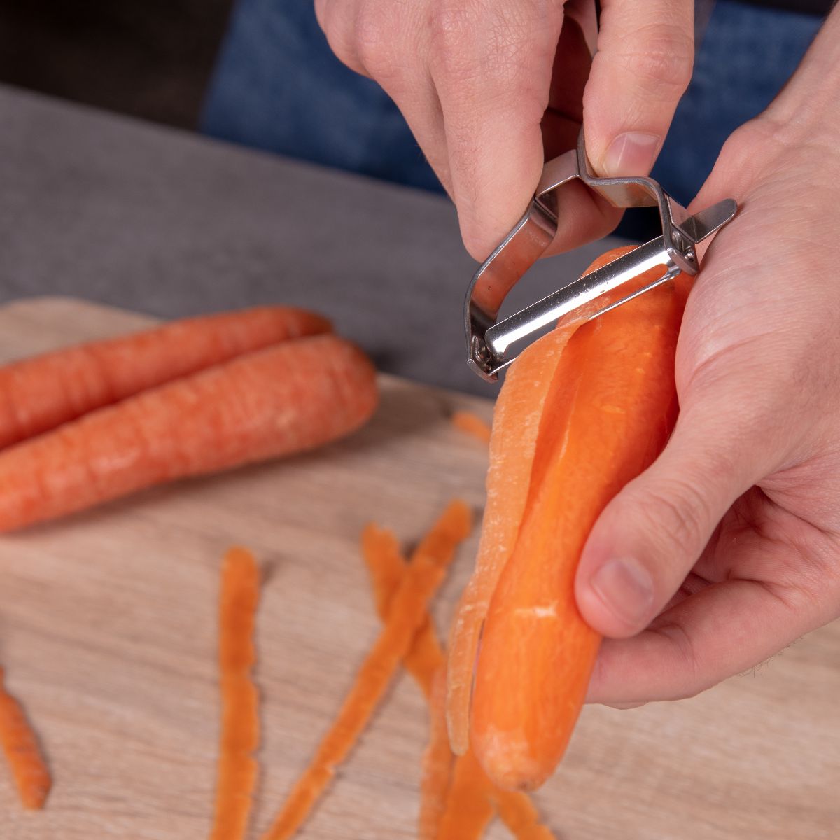 Los pelapatatas se caracterizan por tener la cuchilla lisa. Existen dos modelos complementarios que son el pelatomates, con las cuchillas dentadas, y el pelador para corte en juliana:
