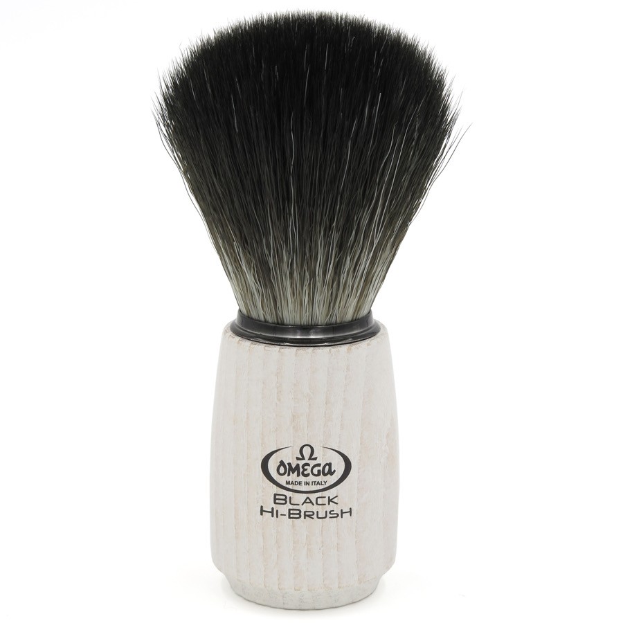 Las fibras sintéticas Black HI-Brush de Omega, con efecto de tejón negro, están hechas a base de un poliéster semicristalino termoplástico. Los filamentos están corrugados para mejorar el rendimiento de la brocha, al retener y liberar la espuma durante el afeitado.