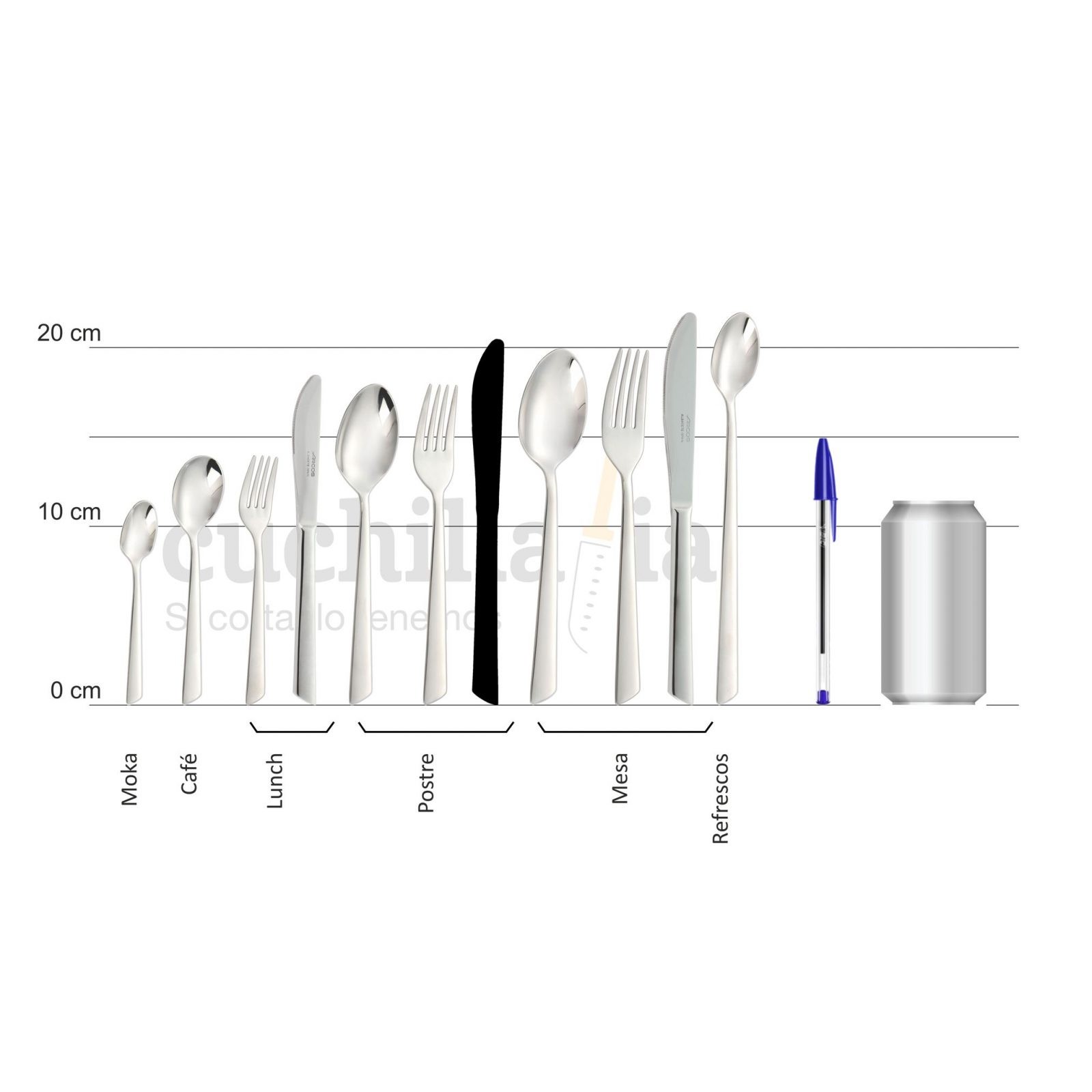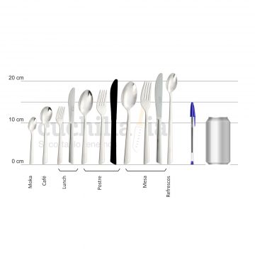 A veces es difícil elegir un cubierto si solo tienes la medida del largo. Como dicen que una imagen vale más que 1000 palabras, en Cuchillalia.com te lo ponemos más fácil con la comparativa de tamaños de todos los cubiertos de la serie Toscana de Arcos con un par de objetos que todos tenemos en casa, un bolígrafo o una lata de refresco: