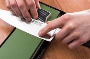 Observaciones:– La guía de afilado Wüsthof se usa para ayudar a que el cuchillo deslice y mantenga un ángulo de 14 grados mientras se afila.