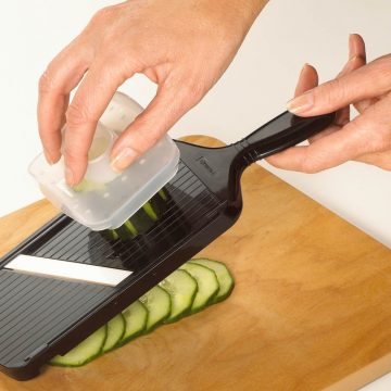 Mandolina CSN-202BK de Kyocera, de color negro con hoja de cerámica, regulable, para un corte en 4 espesores diferentes y muy finos: