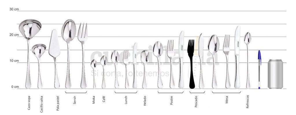 A veces es difícil elegir un cubierto si solo tienes la medida del largo. Como dicen que una imagen vale más que 1000 palabras, en Cuchillalia.com te lo ponemos más fácil con la comparativa de tamaños de todos los cubiertos de la serie Madrid de Arcos con un par de objetos que todos tenemos en casa, un bolígrafo o una lata de refresco: