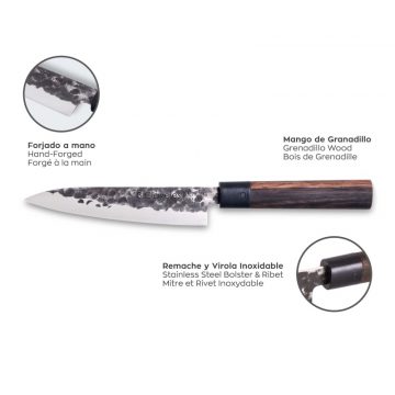Cuchillo de tipo intermedio verdulero, la hoja forjada a mano con DOBLE BISEL, en su parte más ancha tiene 34 mm y grosor de 2,5 mm, acero inoxidable 5Cr15Mov, dureza 57+-HRc junto un filo de fabrica que corta el papel muy limpio, el martilleado de la hoja y el mango de madera de granadillo y encerado que lo hace muy agradable al tacto. Este cuchillo es ideal para el que quiera iniciarse en la cuchillería y estética japonesa, para probar el agarre de esa empuñadura totalmente diferente a los occidentales y para el que busca un cuchillo de estilo japonés a un precio contenido y accesible y lo mejor de todo fabricado en España. CUCHILLALIA totalmente recomendada por el envío y la atención recibida por ALAN.