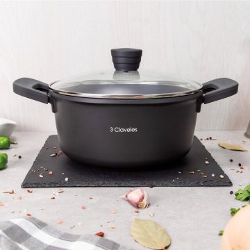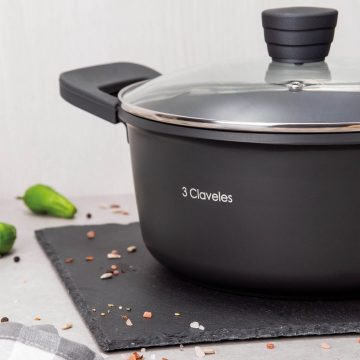 La cacerola con tapa 3 Claveles Dark Collection de 24 cm con su superficie antiadherente tricapa reforzada con titanio (PPG QuanTanium) ofrece una excelente relación calidad/precio. Se trata de una cacerola de primera, con retención del calor gracias a su masa superior y una mejorada distribución del calor.