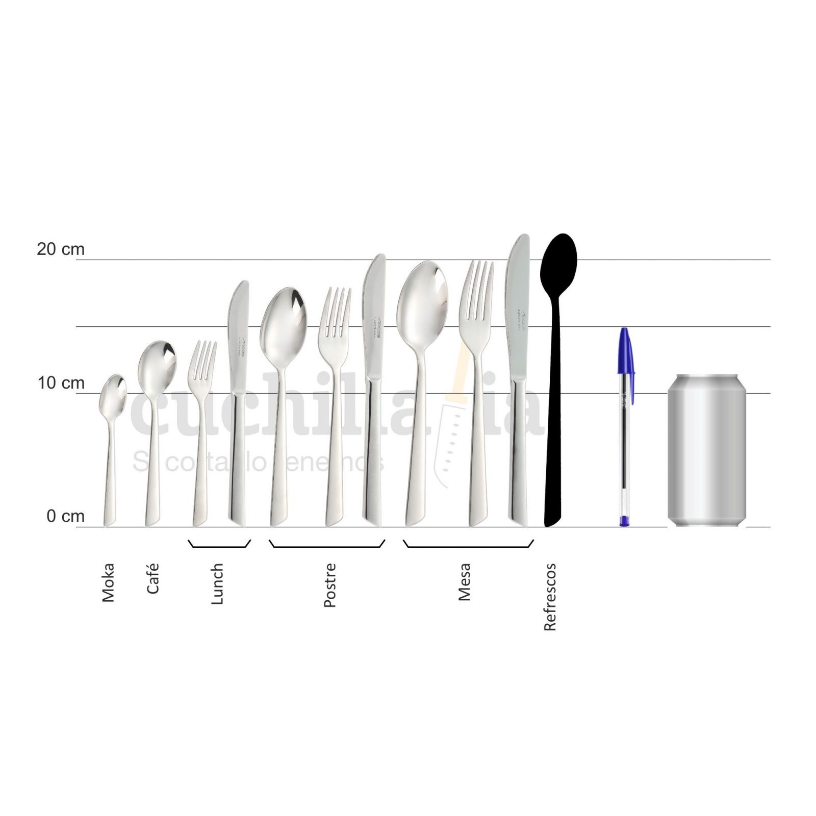 A veces es difícil elegir un cubierto si solo tienes la medida del largo. Como dicen que una imagen vale más que 1000 palabras, en Cuchillalia.com te lo ponemos más fácil con la comparativa de tamaños de todos los cubiertos de la serie Toscana de Arcos con un par de objetos que todos tenemos en casa, un bolígrafo o una lata de refresco: